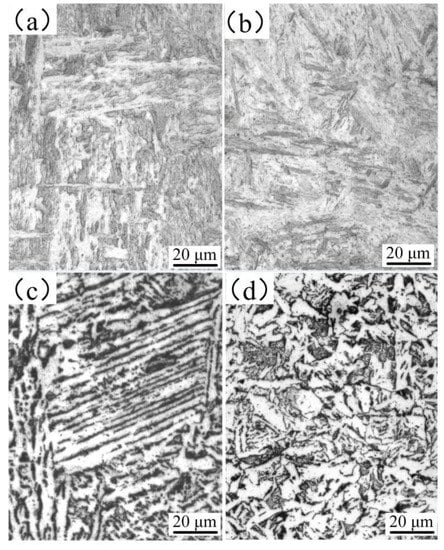 Figure 11 shows the microstructures of the weld. Four regions in the weld were selected for microstructural analysis; the corresponding positions are shown in Figure 10. The microstructure in the upper part of the weld (Figure 11a) consisted of acicular ferrite and lath martensite due to low carbon content and fast cooling rate. The microstructure in the lower part of the weld (Figure 11b) contained flake martensite due to the high content of carbon and other alloying elements. The presence of martensite increases the hardness of the weld. Figure 11c,d show the microstructure of the heat-affected zone of the base material. Figure 11c is the zone near the weld; it shows that a widmanstatten structure occurred in the microstructures, the appearance of which is due to the fast cooling rate in the cooling process. The appearance of a widmanstatten structure reduces the performance of the welded joint to a certain extent. Figure 11d shows the incomplete recrystallization zone of the weld; because the structure of the zone is not uniform, the performance of the zone is not similar.
