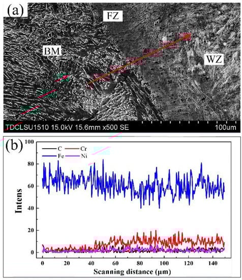EDS line was carried out through the base material (BM), fusion zone (FZ), and weld zone (WZ), as shown in Figure 12. The chemical composition of the base material has quite a different content compared to that of the weld. Inter-diffusion occured between the elements in the weld and the base material due to the thermal effect of the welding process. The closer to the weld, the higher the amount of Cr and Ni content. Similarly, due to diffusion, Fe content in the welding seam increased in the area close to the base material. The FZ is a transitional region, wherein the amount of elements changed abruptly. The differing content of alloying elements lead to different properties and structures. In addition, because the weld seam is a mixture of stainless steel and low carbon steel, the performance of the weld seam is different from that of the stainless steel surfacing layer, which include microstructures, hardness, and corrosion resistance.