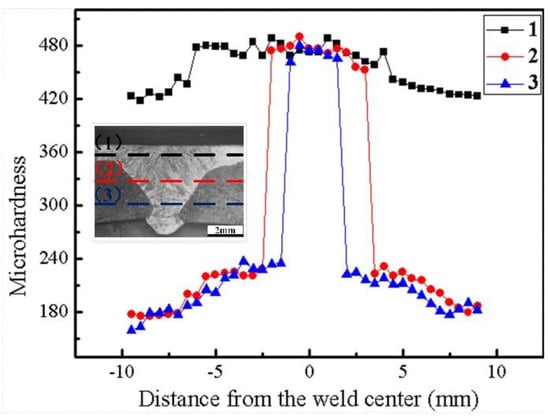 The hardness distribution across the welded joint is shown in Figure 14. As shown in the figure, three hardness indentation paths were taken: (1) through the upper part of the weld; (2) through the middle part of the weld; and (3) through the lower part of the weld. In path 1, the average hardness of the stainless steel surfacing layer on both sides of the weld was about 440 HV. However, the average hardness of the weld area in the same path was about 480 HV. The higher hardness of the weld area is due to the martensitic microstructure, which was produced due to faster solidification speed of the molten pool in the stainless steel part of the weld. Paths 2 and 3 passed through the base material, heat affected zone, and the weld. The hardness profiles exhibited similar characteristics. On both sides, hardness decreased with increasing distance from the weld center. This can be contributed to the formation of a widmanstatten structure, making the hardness of the heat-affected zone higher than that of the base material. Although these three paths are different in structure, the hardness of the weld zone along the three paths remained basically the same, indicating that in the process of welding, the hardness in the weld was uniform.