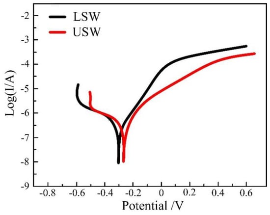 Figure 15 shows the potentiodynamic polarization curves of both the longitudinal section and the upper surface of the weld. The corrosion potential (Ecorr) and current density (icorr), which were obtained from the polarization curves by Tafel extrapolation method, are shown in Table 4. The polarization results indicate that the corrosion resistance of the weld has improved significantly. As can be seen from the figure, the uniform corrosion resistance of the upper surface of weld (USW) is stronger than that of the longitudinal section of the weld (LSW). Compared with low carbon steel, the longitudinal section and upper surface of the weld have better corrosion resistance. However, compared with the surfacing layer, the corrosion resistance of the longitudinal section and the upper surface of the weld is slightly lower. This may be due to the fact that the alloy content in the weld is lower than that of the surfacing layer.