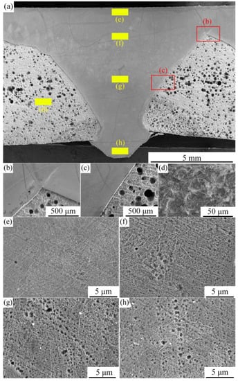 Figure 16 is the surface morphology of the welded joint after corrosion. The corrosion degree of the weld and the base material can be clearly seen in this figure. It shows that the corrosion resistance of the weld is better than that of the base material. However, due to the uneven presence of alloying elements in the weld—more C in the lower part of the weld—the corrosion of the lower part of the weld is greater that that in the upper part. The existence of C forms stable compounds with Cr; thus, more corrosion is found in the lower part of the weld. Corrosion morphology of the weld can be obtained from Figure 16e–h; the figure shows that corrosion increased with proximity to the lower part of the weld.