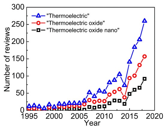 Special attention in this respect is given to technologies of direct heat conversion into electric power [3,4,5,6]. Experimental and theoretical investigations in order to understand the mechanisms involved and to improve the materials properties and conversion efficiency have been ongoing for more than half a century. Particularly, Figure 1 shows the statistics of review papers from 1995 to 2018 on “Thermoelectric”, “Thermoelectric oxide” and “Thermoelectric oxide nano” queries. The annual amount of research has increased more than 20-fold (from 12 in 1995 to 260 in 2018). The highest publication activity in this field is happening now: From 2014, the number of published reviews grew by 40 every year, which corresponds to additional 1000 research papers. They are focused mainly on the thermoelectric properties of oxides and thermoelectric devices based on them (over 50% of papers have studied oxide systems since 2014) (Figure 1).