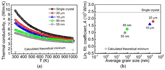 Temperature dependence (a) of effective thermal conductivity for SrTiO3 polycrystalline ceramics and single crystal (also shows a calculated theoretical minimum for disordered crystals with few nm grain size). Size dependence (b) of linear coefficient A for fitting κ(T) = κo + A/T + B/T2. Estimated average grain sizes are shown for some representative samples according to Reference [10].