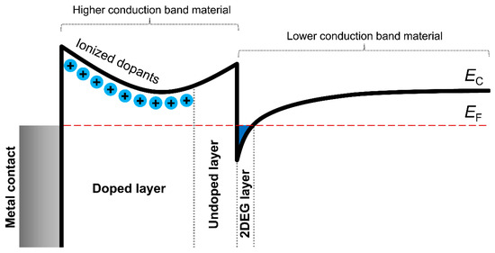 Another mechanism of 2DEG formation on the hetero interface of oxide materials is modulation doping [74]. Electrons from the n-doped material tend to leave it and to occupy the second material at the contact, because the conduction band edge of the first material is higher than in the second one (Figure 4). At the same time, there occurs a non-compensated bulk charge in the first material that distorts the conduction bands locally in the region of the contact with the second material. This yield in electron trap occurring in undoped material near the interface boundary and it is thin enough to form 2DEG. The undoped layer of the material with higher conduction band edge enhances this effect (Figure 4) [74].