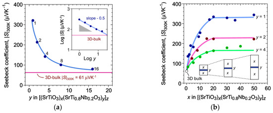 Thermo-emf dependence of Sr(Ti0.8Nb0.2)O3 of layer at 300 K for [SrTiO3]x/[Sr(Ti0.8Nb0.2)O3]y superlattice: (a) On y (thickness of the conducting layer) at sufficient thickness of insulating layers; (b) on x (thickness of insulating layers) at sufficient thickness of conducting layers. Reproduced from [101].