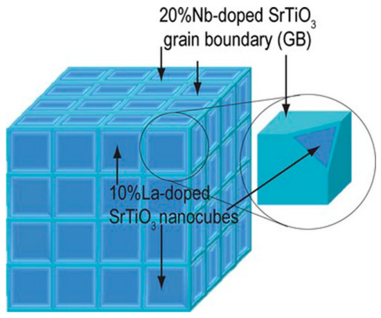“Rubik’s cube” structure of the SrTiO3 ceramics (2DEG grain boundaries are shown in light blue, grain interiors—in deep blue). Reproduced with permission from Reference [11].