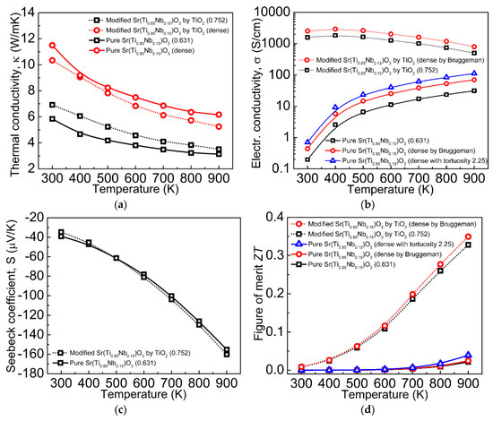 As was mentioned above, the ZT value of the hypothetic model SrTiO3-based material utilizing 2DEG properties at most reaches 0.8–1.2 at 300 °C at minimal thickness of separating layer and small grain size [69]. These factors enable one to expect drastic improvements of thermoelectric properties of the suggested TiO2–SrTiO3 biphase ceramics (Figure 7). It is worth mentioning again that electron tunneling through the thin (1 unit cell) charged edge with 2DEG was not taken into account in [69]. For real systems, this may lower the effect of electron filtration and reduce thermoelectric efficiency.
