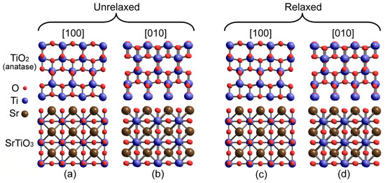 - D’Amico, N.R.; Cantele, G.; Ninno, D. First principles calculations of the band offset at SrTiO3–TiO2 interfaces. Appl. Phys. Lett. 2012, 101, 141606. [Google Scholar] [CrossRef]