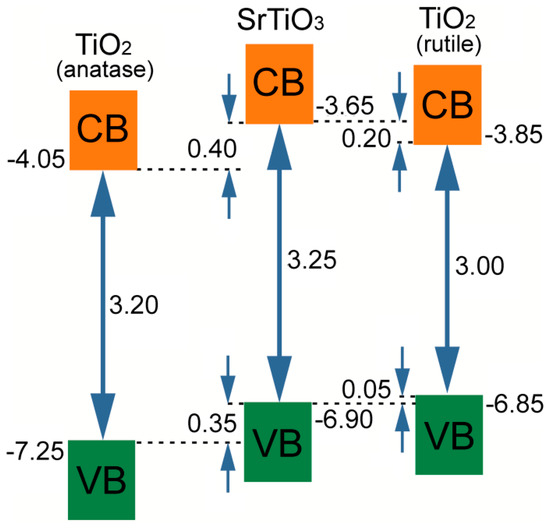 - Fujisawa, J.; Eda, T.; Hanaya, M. Comparative study of conduction-band and valence-band edges of TiO2, SrTiO3, and BaTiO3 by ionization potential measurements. Chem. Phys. Lett. 2017, 685, 23–26. [Google Scholar] [CrossRef]