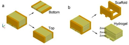 Composite structure design of a bio-hygromorph: (a) scaffold model; (b) model of the bio-hygromorph with the scaffold embedded in hydrogel.