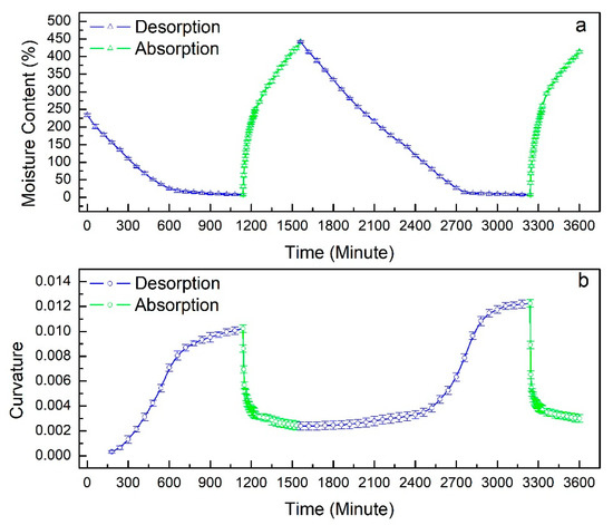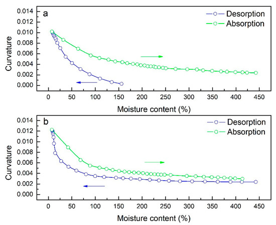 Figure 6a,b shows the relation between moisture content and bending curvature for the first and the second desorption-absorption cycles, respectively. As shown in Figure 6, curvature varied non-linearly with moisture content. As moisture content decreased, bending curvature increased. Notably, significant bending deformation occurred in the moisture content range of 10–160% for desorption and 10–120% for absorption during both cycles.