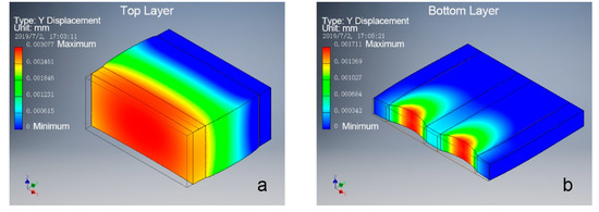 Deformation simulations on a segment model of the bio-hygromorph under identical pressure: (a) deformation of the top layer as the active layer; (b) deformation of the bottom layer as the passive layer. The active layer underwent greater deformation than the passive layer.