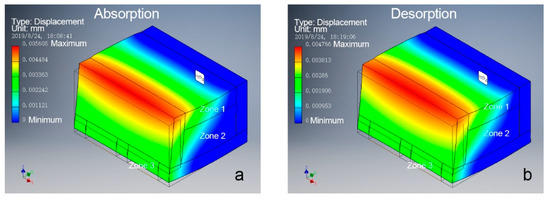 In addition, bending curvature was consistently greater during absorption than desorption for the same moisture content. To investigate the reason behind this phenomenon, bending magnitude analysis was performed on one segment of the bio-hygromorph. The segment was composed of a WPLA scaffold and fish swim bladder hydrogel (Young’s modulus: 2.24 GPa for WPLA, 0.124 GPa and 0.091 GPa for different hydrogel zones), as shown in Figure 2b. The fish swim bladder hydrogel was separated into three zones to simulate the potential nonuniform distribution of moisture content along its center and its edges during the desorption-absorption cycles. Acting as edges, zone 1 and zone 3 shared the same mechanical properties. For absorption, zone 2’s mechanical properties were lower than those of zone 1 and zone 3. For desorption, conversely, zone 2’s mechanical properties were higher. As shown in Figure 7, the simulation results (maximum of displacement) revealed that greater deformations occurred during absorption than desorption, which could be used to explain consistently greater bending curvature during absorption than desorption for the same moisture content.