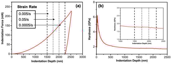 (a) Representative indentation force–depth curve of a strain-rate jump test. (b) Measured hardness versus indentation depth curve. The insert is a magnified figure of the strain-rate jump regime. The changes in the hardness are highlighted.