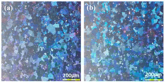 Figure 3a,b represent the grain structures of the as-received Al alloy and that after 12 h pre-aging. In addition, grain size statistics was carried out using the Image-Pro software(v6.0, Media Cybernetics, Washington, WA, USA). More than 2000 grains were measured for the 0 h and 12 h pre-aged AA2524. The grains in the as-received Al alloy were equiaxed, and the average grain size was ≈52 μm. The grain structure and size (≈50 μm) were not evidently altered after 12 h pre-aging, evidencing a negligible effect of the pre-aging time. This was expected, since the aging temperature (180 °C) was much lower than the recrystallization temperature of the Al alloy (300 °C) [].
