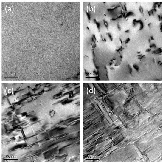 Figure 4 shows the precipitate microstructures of the Al alloy as a function of pre-aging time. The as-received alloy had a low dislocation density and was free of aging precipitate in individual grains. This is a typical microstructure of commercial AA2524 alloys. Note that pre-existing dislocations can be sources of creep deformation and nucleation sites of aging precipitates []. After pre-aging for 3 h at 180 °C, the microstructure was altered by the formation of a large amount of nano-sized precipitate, as shown in Figure 4b. The AA2x24 series alloys are strengthened by the formation of this rod-shaped precipitate during ageing. The precipitation sequence for the ageing of Al–Cu–Mg alloys is: SSS→GPB/S″→S′→S [,]. The optimum aging temperature range of AA2524 is 180–190 °C, resulting in fine and uniformly distributed S′/S phases. As it can be seen from Figure 4b, these precipitates were nucleated and grew near the pre-existing dislocations, corresponding to the S′/S phase, and in the form of laths with the {120}Al habit planes elongated along the <100>Al direction [,]. They were distributed randomly and uniformly in the Al matrices, without obvious pre-orientation effects. The average size of the precipitate was ≈32 nm. As the pre-aging time increased to 6h and 12h, the size of the precipitate constantly increased to ≈60 nm and ≈105 nm, as shown in Figure 4c,d).