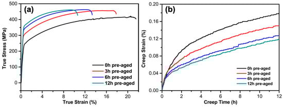 (a) Tensile stress–strain curves of the Al alloy as a function of pre-aging time; (b) creep strain–time curves of the alloy as a function of pre-aging time (elastic strain was removed).