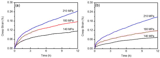Creep behaviors of the 0 h- (a) and 12 h- (b) preaged AA2524 under the applied stress of 140 MPa, 180 MPa, and 210 MPa.