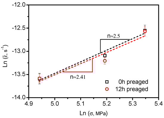In order to explore the mechanism dominating the insensitivity of the steady-state creep of the Al alloy with different precipitate sizes, the stress component (n) of the as-received Al alloy and after 12 h pre-aging was calculated. The stress exponent [,] correlates with the steady-state creep rates () and the stress levels (σ) according to