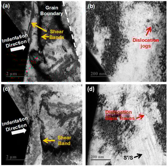 Based on the aforementioned studies, the steady-state creep of the Al alloy was mainly dominated by grain boundary sliding and dislocation activities in individual grains and seemed independent of the precipitate size. In order to minimize the effect of grain boundaries and explore the steady-state creep mechanism dominated by precipitate growth, an indentation strain-rate jump test was performed on the as-received Al and after 3 h, 6 h, and 12 h of pre-aging. As the penetration depth was only 2500 nm, which covered only a few grains, the main creep strain should be mainly accommodated by the plasticity of the grain closest to the indenter, and this would highlight the effect of the dislocations and their interactions on the precipitate. This was shown by the detailed TEM characterization of the indent imprint cross sections of the as-received Al alloy and of the alloy after 12 h of pre-aging after unloading. In Figure 8a–d, the deformation of the Al alloys under the indenter was highly localized, as evidenced by the high dislocation densities in the grains closest to the indenter. Due to the inhomogeneous stress field generated, shear bands were generated where the stress was concentrated in the grain. Massive dislocation activities, such as dislocation entangles, jogs, dislocation slips, were observed, which suggests a major role of dislocation in the indentation creep mechanism of the Al alloys under study.