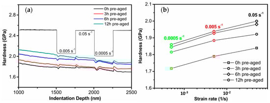 Figure 9a plots the indentation hardness versus the indentation depth during indentation strain-rate jumping from 0.05/s to 0.0005/s, showing variations of the hardness at different strain rates. In agreement with the macro-tensile results (Figure 5a), the micro hardness of the Al alloy increased as the pre-aging time increased from 0 h to 12 h, due to the precipitate hardening effect, as shown in Figure 9b. It is instructive that a higher strain rate generally yielded a stronger response for all alloys, which indicates an apparent time-dependent (creep) property of the Al alloy at the micro scale.
