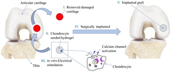 Various steps involved in tissue engineering of knee articular cartilage using electrical stimulation by replacing defect site with chondrocyte-seeded hydrogel (adapted from []).