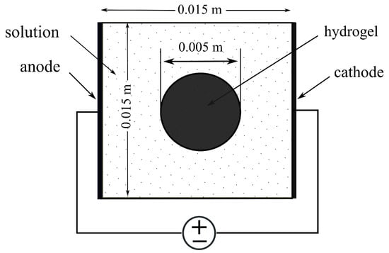 In the current study, the model proposed by Wallmersperger et al. [] was adapted to carry out finite-element simulations. The geometry of the problem is shown in Figure 2, where a square hydrogel sample was first considered for validation instead of the circular hydrogel sample. The model comprised two coupled nonlinear differential equations, i.e., Poisson and Nernst–Planck equations, described below. The PNP equations present several difficulties when computing approximate solutions. It is a strongly coupled system of n + 1 nonlinear equations, so computational efficiency plays a critical role in the implementation of the numerical solution, where n is the number of mobile ion species.