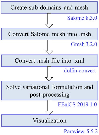 As the geometry considered here is relatively simple, the geometry creation, meshing, and solving the variational problem could all be done using FEniCS, and then visualizing the results using Paraview []. For physiologically more complicated geometries, a more comprehensive open-source simulation workflow was implemented as well, which consisted of SALOME (www.salome-platform.org) for geometry creation, Gmsh [] for meshing, the solution of variational problem using FEniCS, and then result visualization using Paraview. The complete open-source workflow is shown in Figure 3. The results presented here are the same by using either of the two simulation workflows discussed here. The models and the Python scripts used in this study are available in an online repository (https://github.com/arfarooqi/Electro-active-hydrogels).