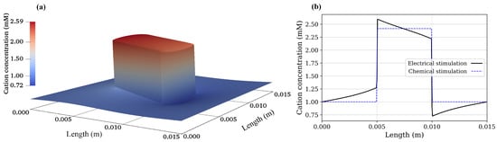 Cation concentration: (a) 2D electrical stimulation, (b) comparison of chemical and electrical stimulation versus x-position at y = m.