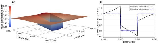 Anion concentration: (a) 2D electrical stimulation, (b) comparison of chemical and electrical stimulation versus x-position at y = m.