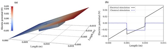 Electric potential: (a) 2D electrical stimulation, (b) comparison of chemical and electrical stimulation versus x-position at y = m.