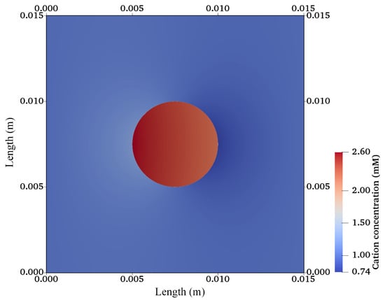 For the electrical stimulation, Equations (6) and (18) were again solved numerically for two ionic species using FEniCS with the parameters listed in Table 1. The convective flux was assumed to be zero and no chemical conversion was considered in the equations. The values obtained due to the chemical stimulation were taken as initial conditions for the electrical-stimulation problem, and an external electric potential of 50 mV was applied at the solution boundaries. To achieve the rapid convergence of the solution, local mesh refinement was used, which extended m on both sides of the hydrogel–solution interface.