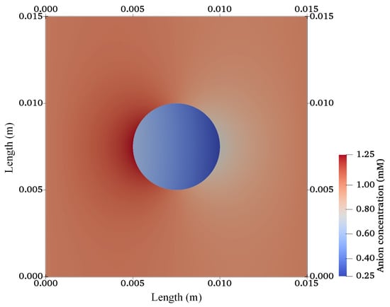 After validation, the finite-element model was extended for a 2D circular specimen (approximation of a 3D cylindrical sample) immersed in solution as used in cartilage–tissue engineering [] and shown in Figure 1. Figure 7, Figure 8 and Figure 9 show the graphs of the anion, cation, and electric potential distribution in the solution and in the hydrogel scaffold in steady state. Because of the presence of fixed-charge ions in the hydrogel, there was a sharp change in electric potential and in the concentrations of anions and cations to satisfy the electroneutrality condition. In comparison to the initial conditions, the concentrations of cations and anions were slightly higher in the hydrogel on the cathode side as compared to the anode side. Similarly, ion concentrations in the solution near the hydrogel–solution interface increased at the cathode side and decreased at the anode side. From these figures, it can be concluded that the ion concentrations and electric potential in the hydrogel sample could be optimized as the requirement by varying the different quantities. The computation time was ∼58 min with 22,264,695 DoFs on a workstation with 256 GB RAM, Intel(R) Xeon(R) CPU E5-2687W v4 @ 3.00 GHz.
