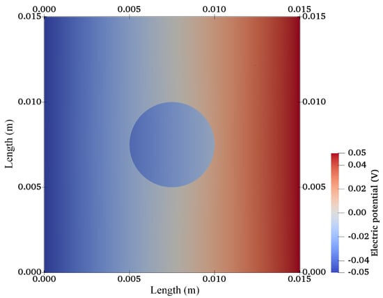 For the numerical solution of the PNP equations, mixed-function space [] consisting of three scalar functions, i.e., anion, cation, and electric potential was used with Lagrange elements [,] of Order 2.