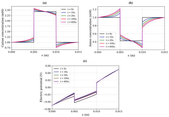 Transient simulations for variations of the ionic concentration and electric potential are also presented in Figure 10. It was observed that, at initial time , the distributions of ionic concentrations in whole computational domain are symmetric, same as from the chemical stimulation without external electric field. As time increased, the diffusive ions redistributed continuously in both the hydrogel and the 1 mM NaCl solution, and the ionic-concentration differences near the hydrogel–solution interfaces became increasingly larger. Ionic diffusion and convection reached the equilibrium state after a specific time, which was dependent on various parameters and conditions, including the electric field, fixed charge density, and NaCl solution concentration. Thus, the concentration of ions and the electric potential in the hydrogel sample could be optimized at various time intervals. For the current case, the steady-state solution for all variables was obtained at around 800 s, after which no further change in the ion concentrations and electric potential occurred. These results follow the same trend as observed by Wallmersperger et al. [].