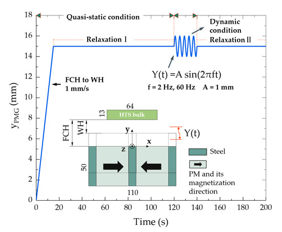 Figure 1 shows the computation subdomains of the dynamic model and the movement process of the PMG. In the modeling, the PMG first moves from the field-cooling height (FCH = 30 mm) to the working height (WH = 15 mm) at 1 mm/s. This process takes 15 s. Afterwards, it relaxed from 15 to 120 s (Relaxation I) to let the flux fully redistribute. Then, a sine function with 1-mm amplitude is applied to the PMG for 20 s. After the dynamic condition, the second relaxation process (Relaxation II) takes place, which is from 140 s to the end. In the dynamic condition, the vibration frequency conditions of 2 and 60 Hz are calculated, respectively. According to the size of the circular PMG in the experimental equipment SCML-03 [21], the vibration frequencies of 2 and 60 Hz are corresponding to the linear velocity of 34 and 1018 km/h for the Maglev above the PMG, respectively.