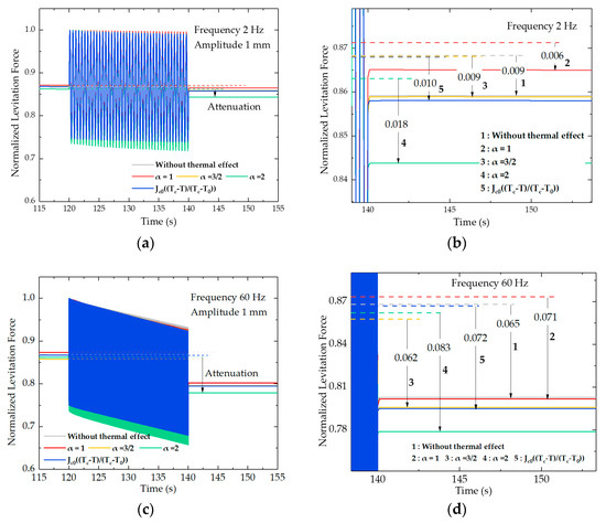 Figure 3 further displays the normalized dynamic levitation forces from 115 to 155 s at 2 and 60 Hz by five different calculations of different Jc–T formulas. Figure 3a,c show the general view of the dynamic process, while Figure 3b,d zoom in the vibration end to better compare the different levitation force changes. The corresponding movement of the PMG is depicted in Figure 1. It is found that the continuous vibration of the PMG can lead to the levitation force attenuation. Table 2 collects the attenuation values of each case. The attenuation is the difference between the results obtained at the beginning (120 s) and the end (140 s) of the dynamic condition process, which can be seen in Figure 3b,d. We can find in Table 2 that with the increase of the frequency, the attenuation gets more obvious. This is because the flux inside the HTS bulk under higher vibration frequency is more intense. Other studies in the literature [15,16] have concluded that the levitation force is a little higher when not considering the thermal effect than when accounting for the thermal effect, because the attenuation caused by thermal loss is not considered. From this point of view, under the experimental vibration condition, the force attenuation without the thermal effect is a little smaller than the case considering the thermal effect, in which Jc retains some mathematic relationships with temperature T during the calculations. As shown in Table 2, the calculated force attenuation without considering the thermal effect is 0.009 at 2 Hz, and 0.065 at 60 Hz. However, the calculation results considering the thermal effect, such as 0.006 under α = 1 at 2 Hz and 0.062 under α = 3/2 at 60 Hz, are smaller. In addition, 0.010 under the linear function and 0.009 under α = 3/2 at 2 Hz are almost the same, with 0.009 at 2 Hz without any thermal effect. Therefore, only the results calculated by Equation (7) with α = 2 are satisfied and reasonable, which is the same conclusion by the quasi-static comparison in Figure 2.