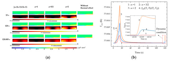 Comparison of different Jc–T relationships of Jc = Jc1(1-(T/Tc)2)α with α = 1, 3/2, 2 and Jc = Jc0((Tc-T)/(Tc-T0)) under 60 Hz. (a) Current density and temperature profile inside the HTS bulk at 15 s, 120 s, and 120.005 s; (b) maximum temperature Tmax inside the HTS bulk versus time.
