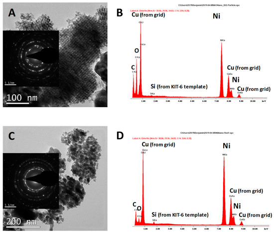 The nanocasting route for preparing metal oxides involves the elimination of the hard templates (in our case silica). Therefore, it is important to control the extent of the silica removal in order to check the quality of the synthesis. The chemical composition of the specimens was then undertaken by EDX analysis, using a transmission microscope. Thus, the EDX analyses of both precursor and NiNC catalysts are shown in Figure 3B,D. Positively, the amount of silicon observed in both cases is very low (Si/Ni at. ratio lower than 0.5%). In the EDX analyses, other elements, such as C and Cu, have been detected, due to the use as a sample holder of holey-carbon film supported on copper grids. Oxygen has been also detected, showing in the NiO precursor a higher relative amount than in the final catalyst, in agreement with the different nickel-containing species present in each sample. Moreover, in these samples, the presence of sodium from the sodium hydroxide used to remove silica can be possible if the washing procedure is not thoroughly undertaken. Interestingly, in our case, EDX analysis does not reveal the existence of sodium and, if present, is below the detection limit of the technique.