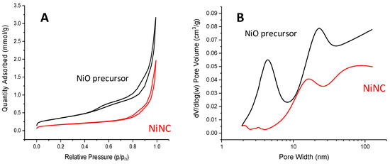 Adsorption-desorption isotherms (A) and pore distribution (B) of both the NiO precursor and the NiNC catalyst.