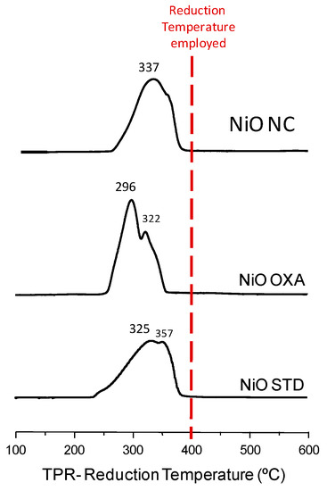 Previously to undertaking the reaction, the nickel oxides were reduced at 400 °C in the hydrogen flow. We used that temperature to ensure that all nickel oxides were reduced into metallic nickel. The temperature programmed reduction experiments show that, for all nickel oxide precursors, total reduction takes place at temperatures below 400 °C (Figure 5).