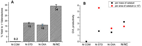 Catalytic results of the levulinic acid transformation into γ-valerolactone on different Ni catalysts: (A) Yield to γ-valerolactone, (B) productivity to γ-valerolactone per mass of catalyst (■) or per surface area (●). Notes: Reaction temperature = 180 °C, reaction time = 2 h, 62.5 mg of catalyst and remaining reaction conditions in the Materials and Method section. Productivity per mass of catalyst expressed as molGVL Kgcat−1 h−1. Productivity per area of catalyst expressed as 10−4 molGVL m−2 h−1.