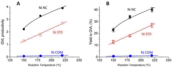 Effect of the reaction temperature on the catalytic performance of NiNC (■), NiSTD (□), and NiCOM (●): (A) Productivity to γ-valerolactone per mass of catalyst, (B) yield to γ-valerolactone, Notes: Reaction temperature = 150–220 °C, reaction time = 2 h, 62.5 mg of catalyst, remaining conditions in the Materials and Method section. Productivity per mass of catalyst expressed as molGVL Kgcat−1 h−1.
