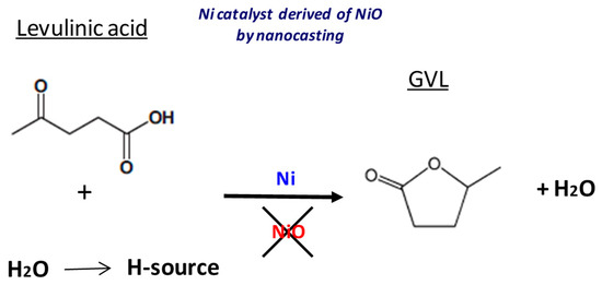 In the future, it would be very interesting to carry out a detailed mechanistic study on the GVL formation from LA using the easy reaction conditions employed in the present work. These metallic nickel catalysts, especially those prepared by a nanocasting route, have shown bifunctionality as they can activate water (as the source for hydrogen) and can also undertake the further hydrogenation step (Figure 9). Conversely to metallic nickel, any nickel oxide tested has shown to be incapable to transform levulinic acid into γ-valerolactone, indicating that nickel oxide cannot selectively activate levulinic acid in these reaction conditions.