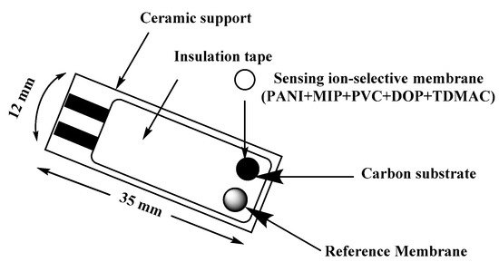 “The design of the screen-printed electrode (SPE) is shown in Figure 1. Both carbon and Ag/AgCl were printed on Alumina substrate of 0.1 mm thickness and 35 mm length. The screen for either carbon or Ag/AgCl ink printing was of 2 mm width. The membrane cocktail of SPEs was prepared by dissolving 100 mg of the components in ~1.5 mL THF as: MIP or NIP beads (9.9 wt %), TDMAC (1.2 wt %), PVC (31.2 wt %), DOP (56.3 wt %) and PANI (1.4%). The reference membrane cocktail was prepared by dissolving 78.1 mg polyvinyl butyral (PVB), 50 mg NaCl in 1 mL methanol. The SPE was rinsed with water and THF before use. 15 µL of the two different membrane cocktails were drop-casting onto the SPE and reference membrane, respectively and left to dry for 6 h”.
