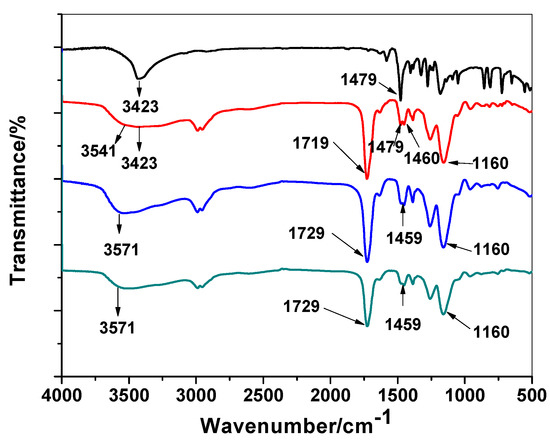 Polymer characterization has been made by FT-IR spectral analysis to show the imprinting process using MMA monomer through the absence/presence of 2,4-DCP on either washed or non-washed polymer beads. As shown in Figure 2, the spectrum of 2,4-DCP showed a strong medium band assigned to stretching O–H band and located at 3423 cm−1. In addition, sharp and strong peak around 1479 cm−1 which is assigned to aromatic ring stretching vibrations. All these assignable peaks clearly appeared in MIP/MMA before the removal of 2,4-DCP and completely disappeared in the spectrum of MIP particles after 2,4-DCP removal. The IR spectrum of MIP/MMA/EGDMA revealed a weak and broad band at 3543 cm−1 for νOH stretching and other peaks at 1719 cm−1 and 1160 cm−1 for –C=O or –C–O stretches, respectively, which are commonly present in all IR-spectra because of the use of EGDMA cross-linkers. The νC=O in both wasged MIP and NIP beads was located at 1729 cm−1.