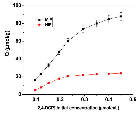 where Q is binding capacity (μmol/g), Ci the initial DCP concentration (μmol/mL), Cf the final DCP concentration (μmol/ml), Vs the volume of tested solution (mL) and mMIP the mass of dried polymer (mg). The calculated binding capacities were used to plot the binding isotherms (Figure 4).