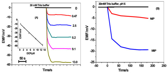 (A) The dynamic potentiometric responses of screen-printed platform towards neutral 2,4-DCP in 30 mm Tris buffer at pH 5. The inset shows the measuring calibration plot for 2,4-DCP; (B) The potential responses to 2.5 μm neutral 2,4-DCP using the blank, NIP and MIP based membranes.