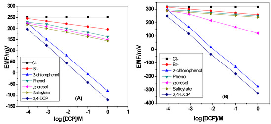 Molecularly imprinted polymers (MIPs) when integrated with electrochemical sensors have picked up a great attention because of their high selectivity and sensitivity [20,21,22]. In addition, these artificial receptors have high robustness, good stability towards high temperatures and pressures, high resistance towards chemical changes, cost-effective, and can be re-used without remarkable deterioration [23]. Recently, integration of MIPs with ISEs revealed a success in organics detection [24,25,26]. Only very few potentiometric sensors for 2,4-DCP determination were reported recently [24,27]. Doping of quaternary ammonium salt in polymeric membranes revealed a super-Nernstian response towards electrically neutral phenolic compounds at neutral pH values. These unexpected anionic responses are due to the net movement of H+ ions to the aqueous medium coming from the membrane. These H+ were induced after the complexation of neutral phenols with the quaternary ammonium salt present in the sensing membrane [20,23,28].