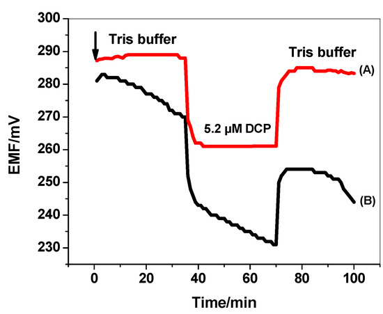 For a liquid-contact ISE, the membrane sensor is usually conditioned with the primary ion and the potentiometric response is measured under classical equilibrium conditions (30 mM HCO3−/CO32− buffer, pH 10). In our previous work, it was found that phenols in their neutral forms revealed super-Nernstian anionic responses for polymeric membrane potentiometric sensors containing quaternary ammonium salt and MIPs under near-neutral pH conditions [20,45]. These unexpected super-Nernstian anionic behaviors were clarified on the basis of the net movement of H+ ions from the membrane to the aqueous phase. This movement is stimulated by the association of the neutral phenols with quaternary ammonium salt doped in the sensing membrane. According to these, we applied in this work the concept of the non-classical response in 2,4-dichlorophenol (DCP) detection. To ensure the presence of neutral 2,4-DCP, 30 mM Tris buffer solution of pH 5.0 was used as the solution background. To obtain good sensitivity for the detection of neutral DCP, all experiments were done after the optimization of the experimental factors. From the obtained results, it was found that the sensors revealed the best response behavior and performance after using the non-polar plasticizer DOP. This confirms that neutral 2,4-DCP prefers the DOP solvent to be extracted into the ISM. Figure 6a represents the response of the screen-printed platform in absence/presence of DCP under the optimized conditions. The amount of 2,4-DCP is estimated from the difference in potential between the baseline values and those at a fixed time (i.e., 100 s). At higher concentrations of DCP, we noticed stronger anionic response due to the more net movements of H+ from the membrane to the aqueous phase [28]. The obtained results indicated that the electrodes revealed a potential response which is directly dependent on the concentration of neutral DCP. The sensor can detect low level concentration of 2,4-DCP down to 0.13 µM within a linearity range starts from 0.47 to 13 µm.